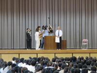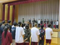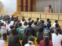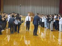 樽野校長からは、学校生活、ひいては人生を充実させるために必要なことについてのお話がありました。その後、本校で15年、警備員としてご勤務いただいた米倉文和さんの退任式が行われました。米倉さんから、懐かしいお話、そして温かい励ましのお言葉をいただきました。本校生も、応援団の指揮で応援歌一番を歌い、盛大な拍手でお見送りしました。